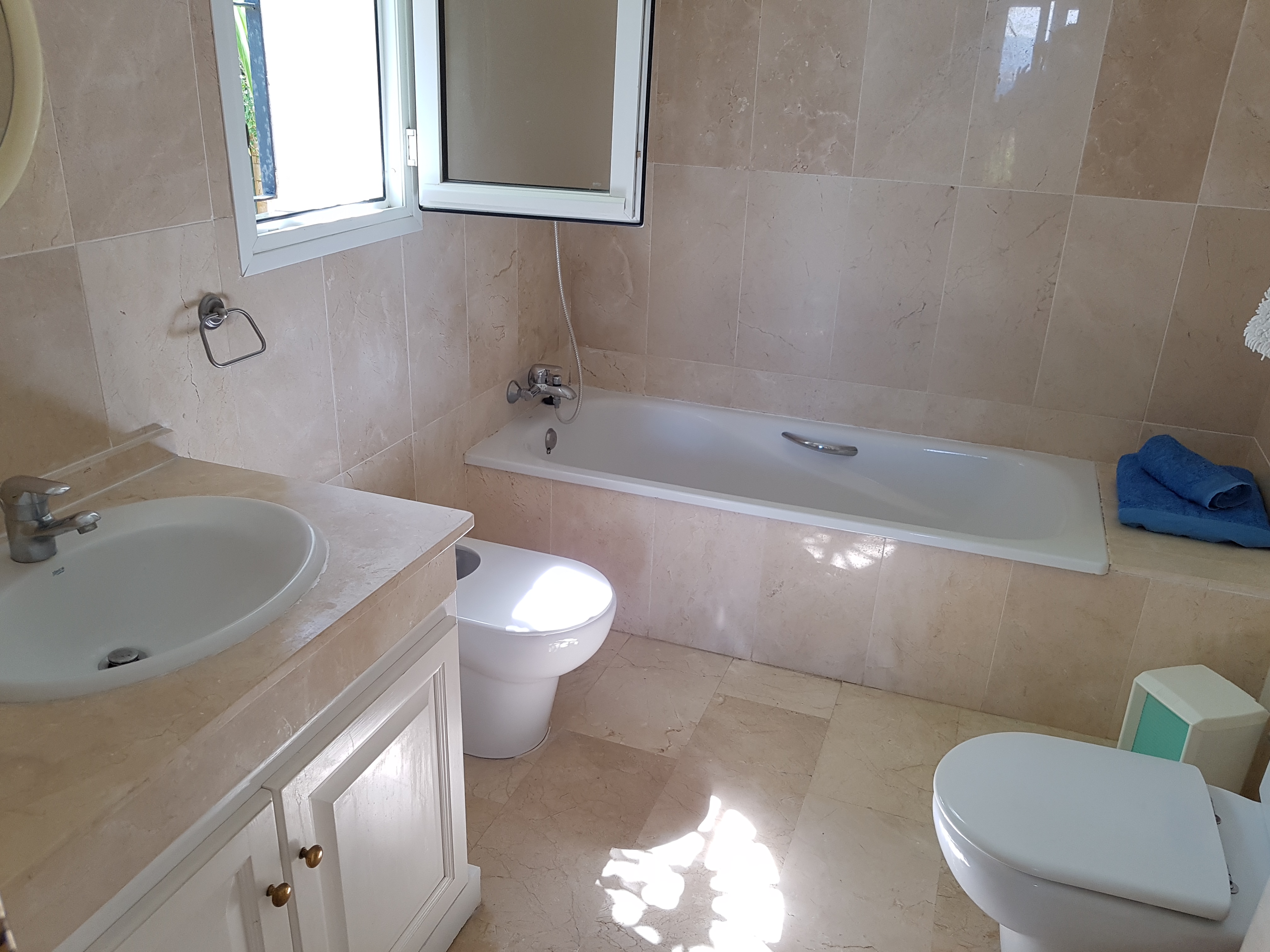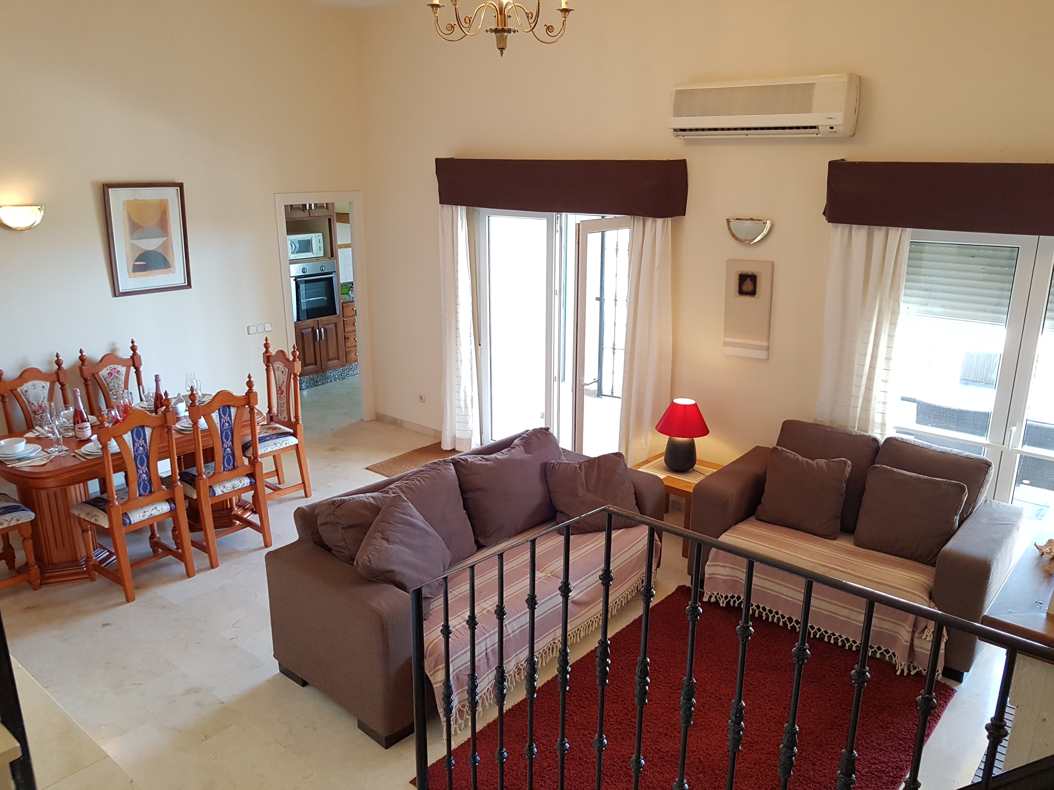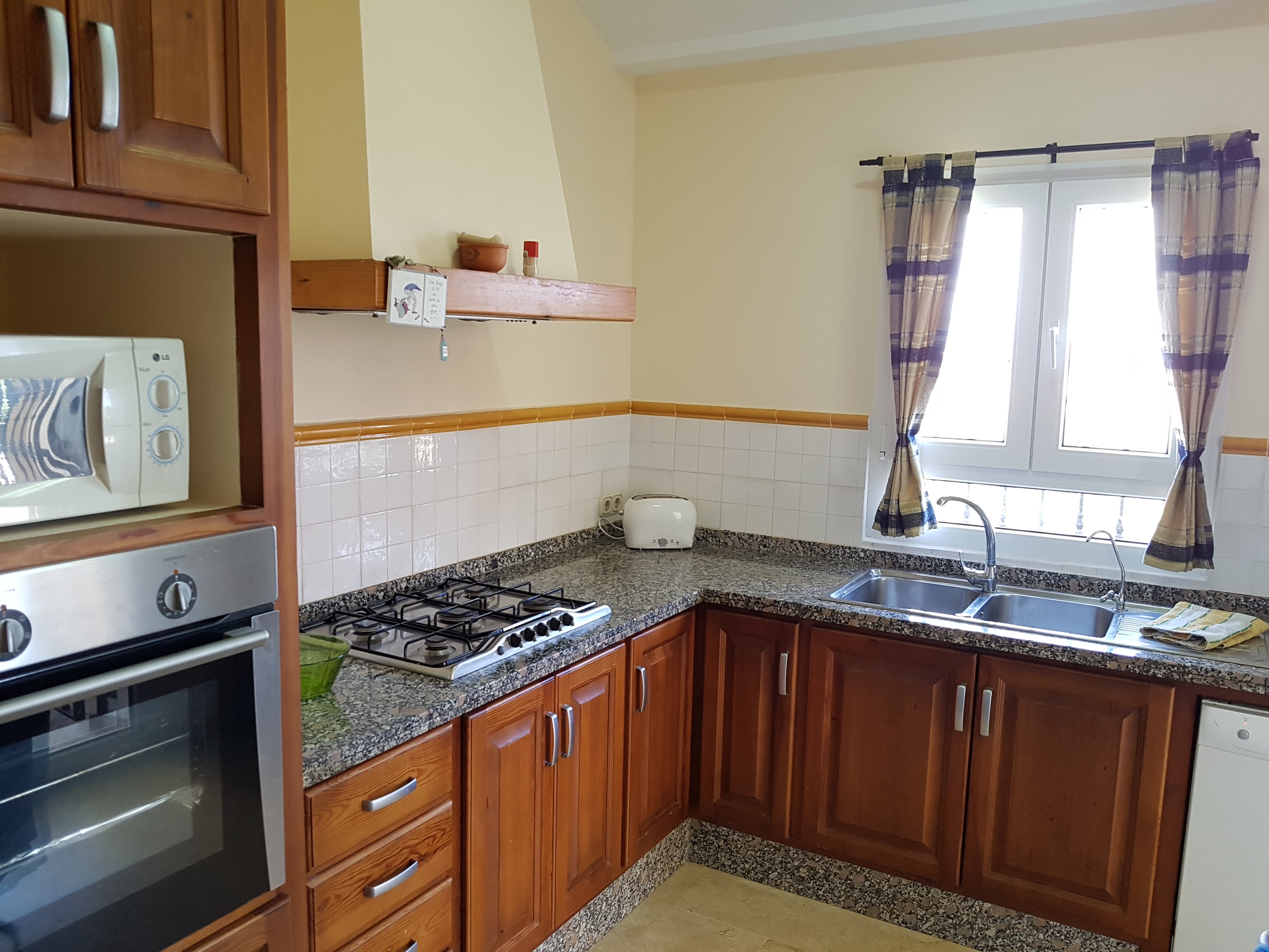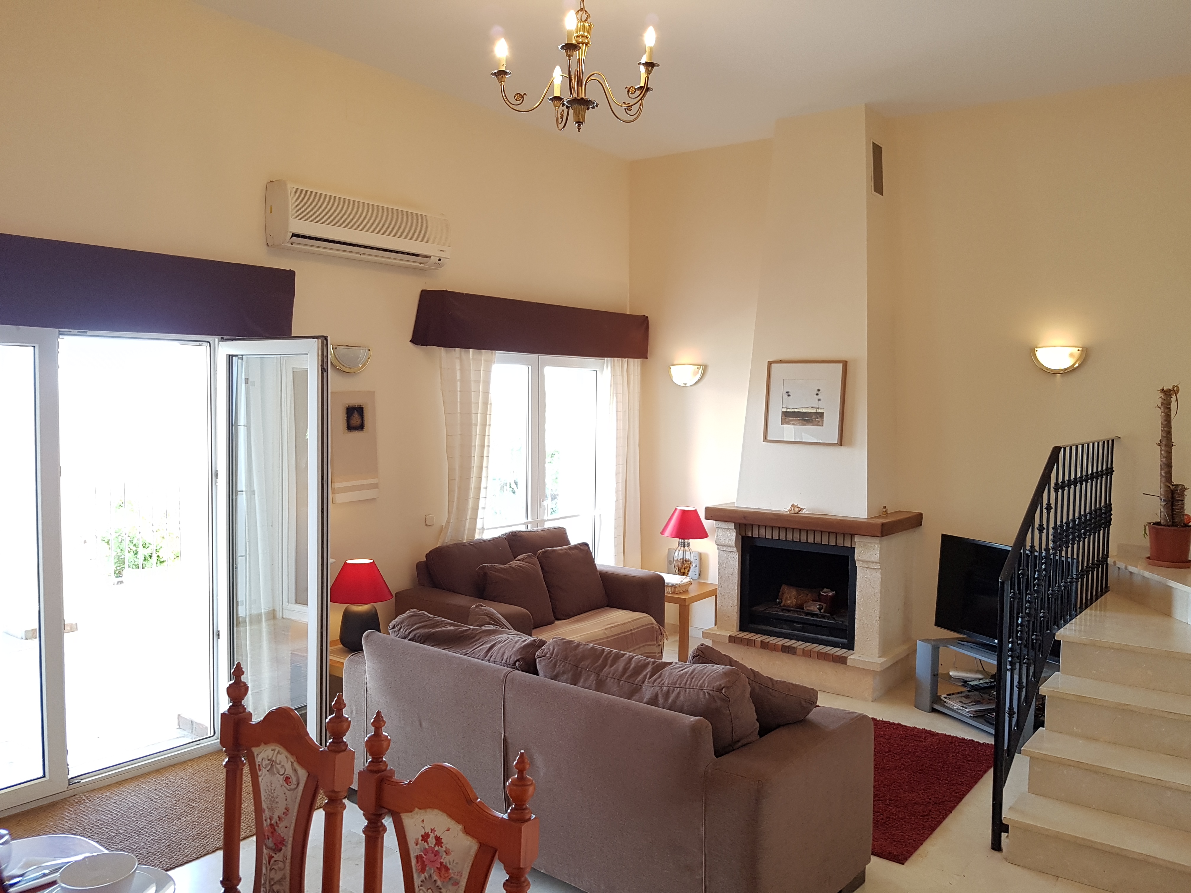 Diese Villa hat alles, was man sich nur wünschen kann in einem luxuriösen Haus oder Ferienhaus. Sie ist sehr geräumig, mit hohen Decken für viel natürliches Licht. Beim Betreten der Villa gelangen Sie nach ein paar Schritten in das offene Wohn-und Esszimmer, wo Sie einen wunderbaren Kamin und 2 doppelte Terrassentüren finden. Die Küche befindet sich direkt neben dem Essbereich. Es ist eine moderne, funktionale und komplett ausgestattete Küche. Auch von hier gibt es eine Terrassentür um auf kurzem Weg das Essen auf die Terrasse bringen zu können. Das Hauptschlafzimmer, mit eigenem Bad, befindet sich ebenfalls im Erdgeschoss, wie auch ein Gäste-WC. In der ersten Etage gibt es einen großen Flurbereich, der zu weiteren zwei Schlafzimmern führt, beide mit Einbauschränken, sowie ein zweites Badezimmer.