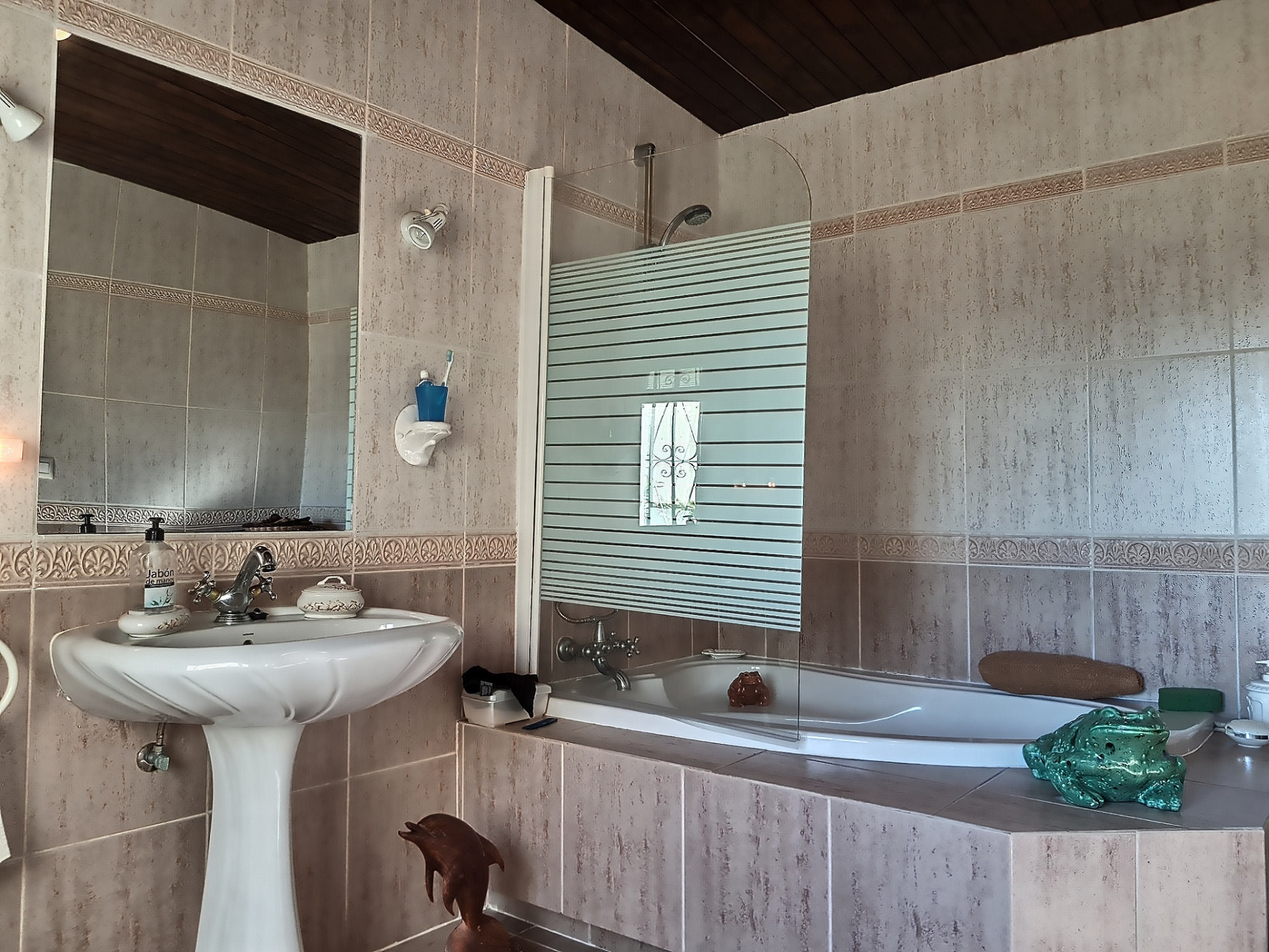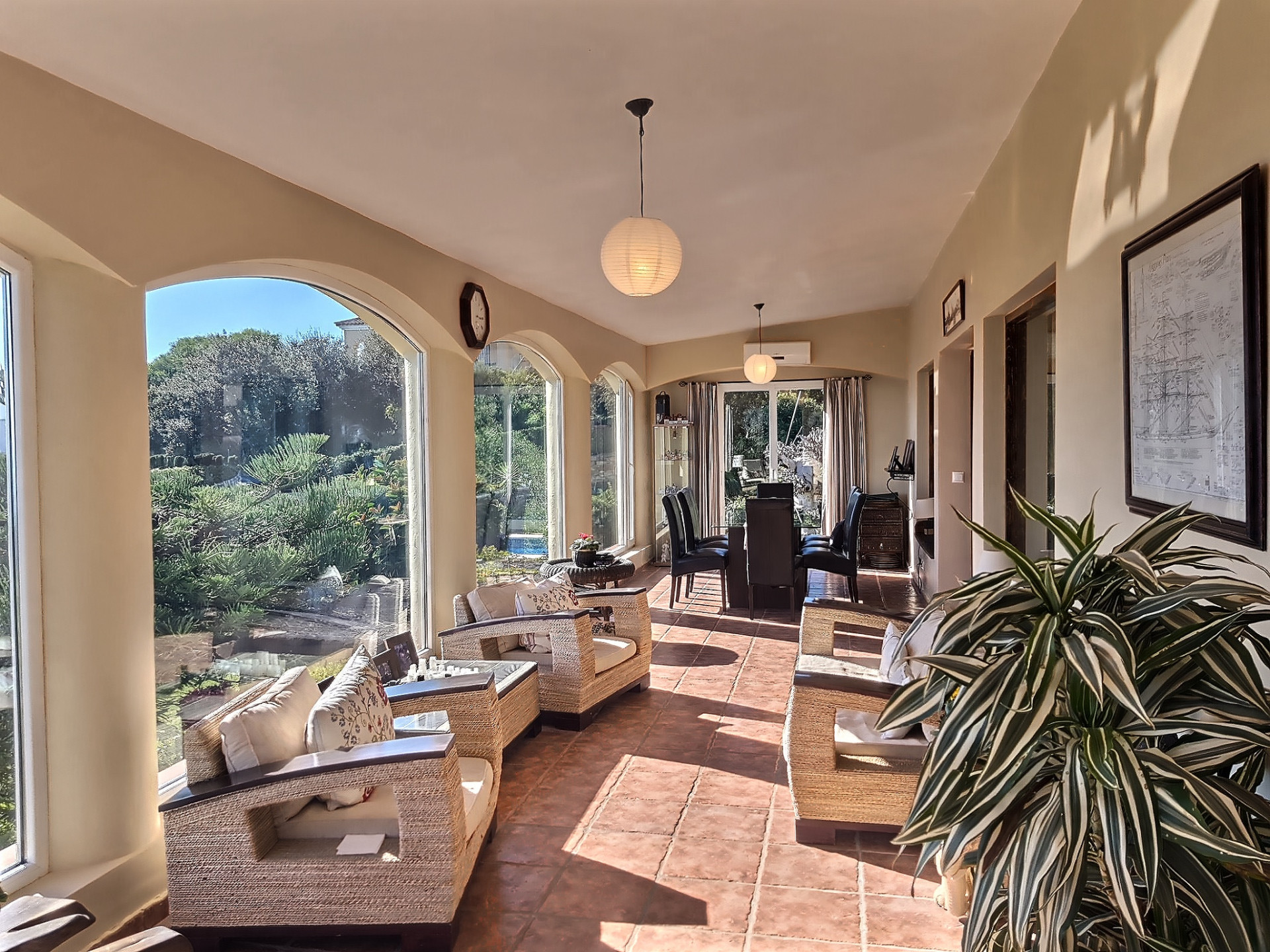 The house has a lovely conservatory porch area, where you can dine with uninterrupted sea views. The living area also has an open fireplace, making the property cosy in the Winter months. In addition to the main villa, their is a self contained 1 bedroom garden apartment with it’s own separate entrance. In total this villa for sale in Torreguadiaro has 4 bedrooms and 3 bathrooms.